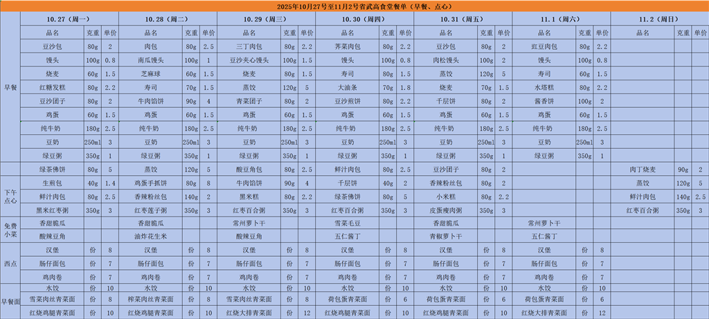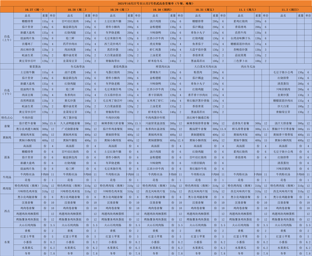 2025-2026学年度第一学期第9周食谱(10月27日-11月2日)