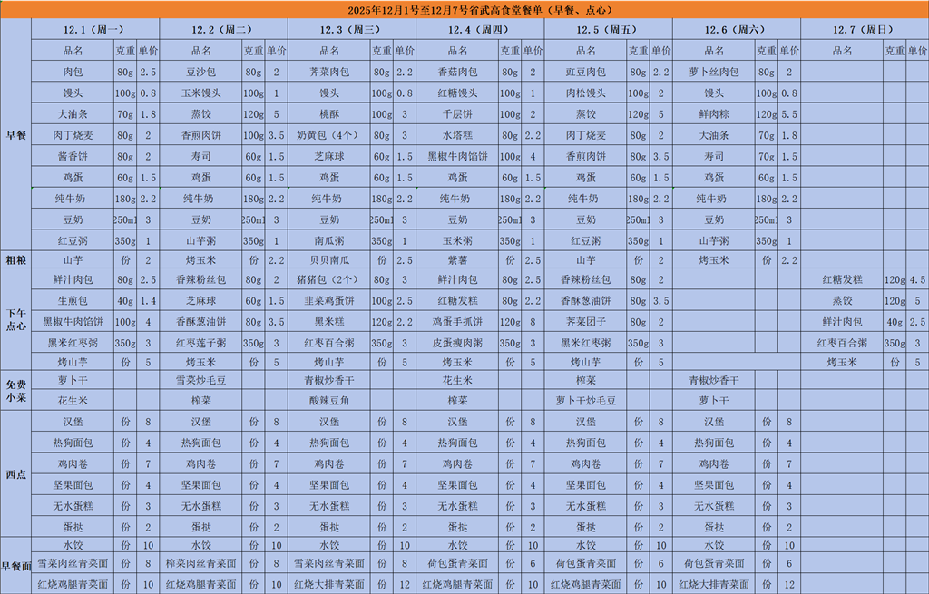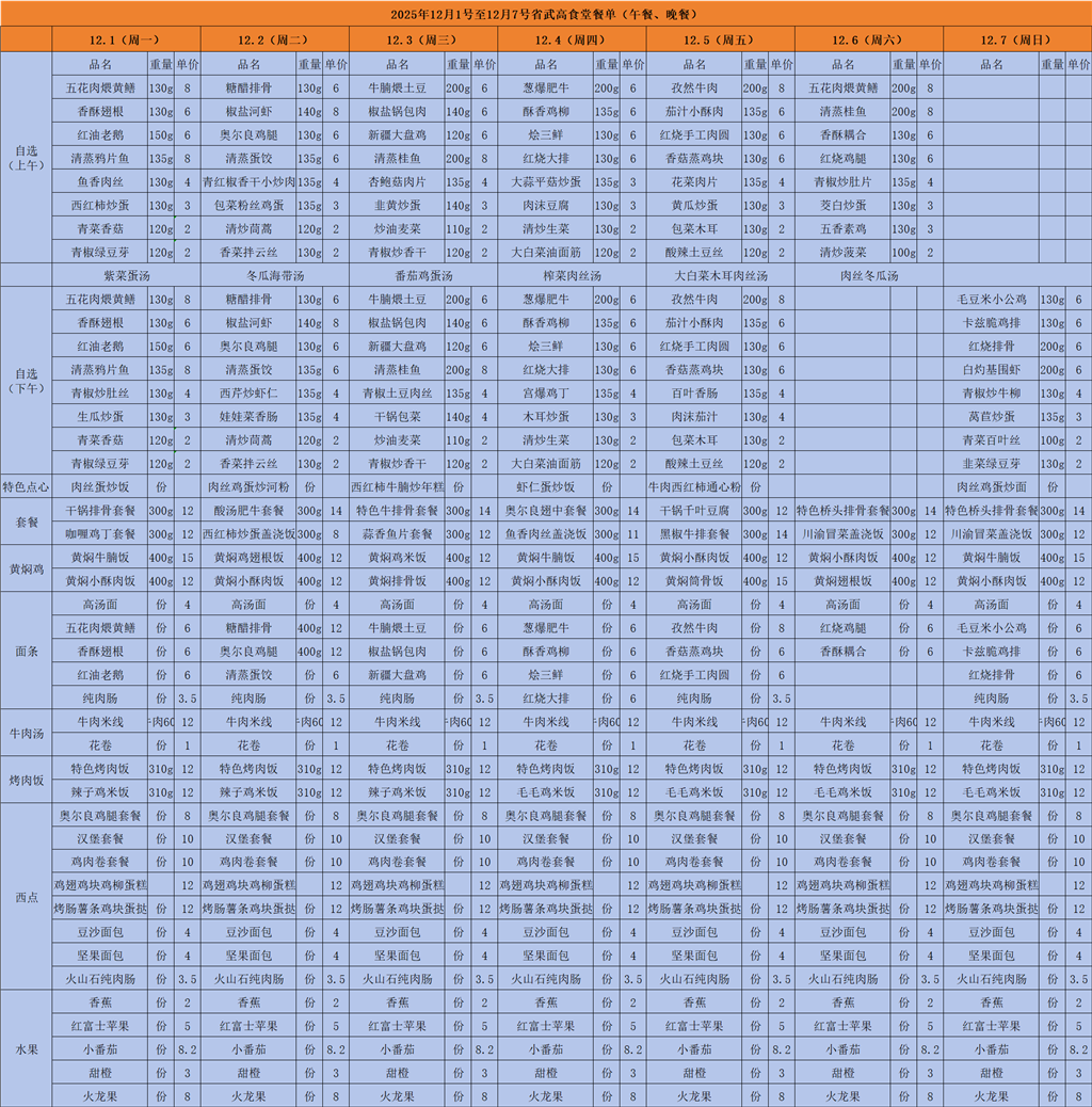 2025-2026学年度第一学期第14周食谱(12月1日-12月7日)