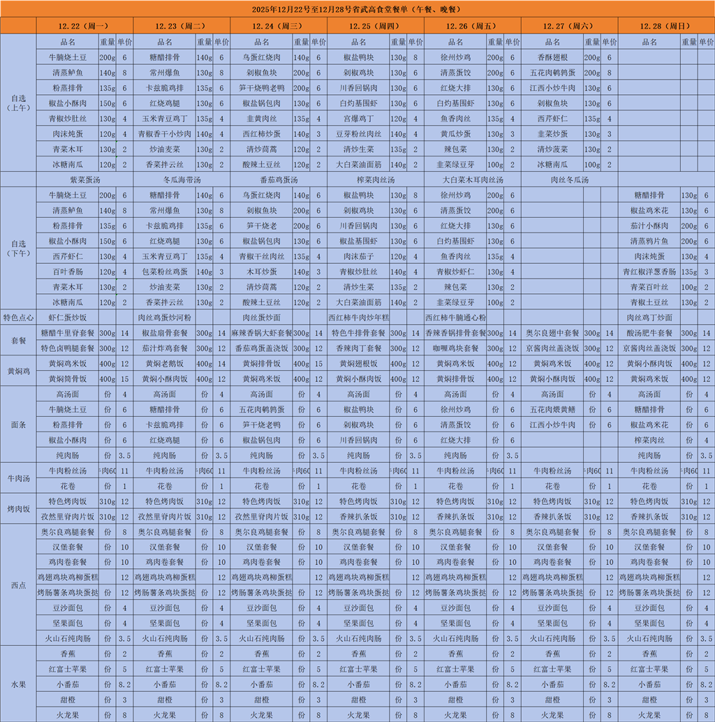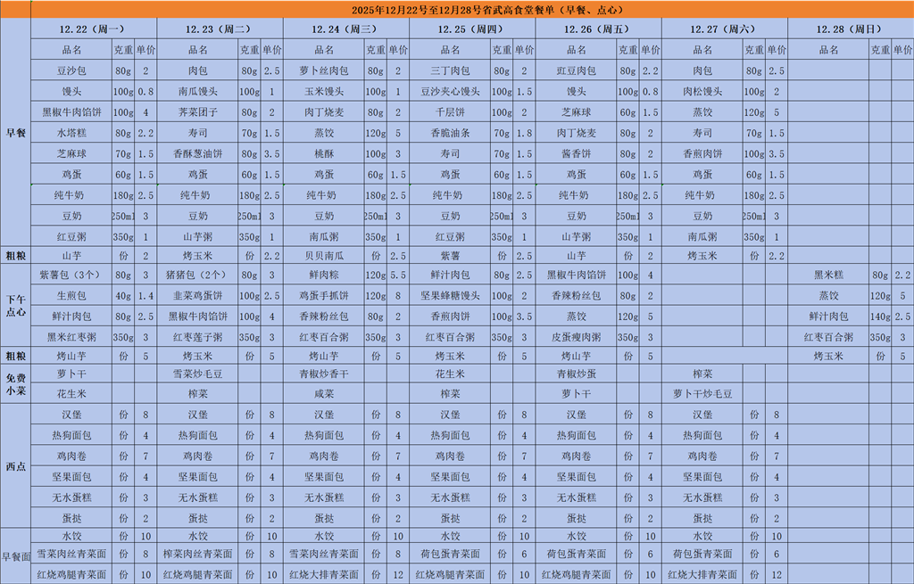2025-2026学年度第一学期第17周食谱(12月22日-12月28日)