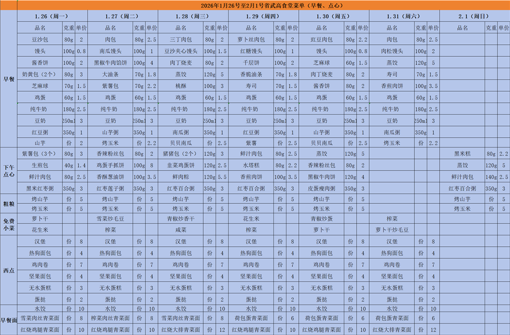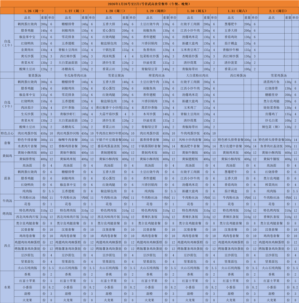 2025-2026学年度第一学期第22周食谱(1月26日-2月1日)