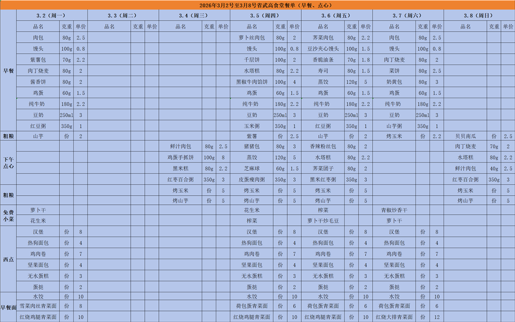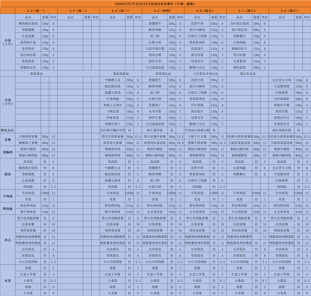 2025-2026学年度第二学期第1周食谱(3月2日-3月8日)